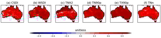 Temporal correlation between ERA5 and AGCD of (a) Cold Spell Duration Indicator (CSDI), (b) Warm Spell Duration Indicator (WSDI), (c) Number of days when minimum temperature is below 2 °C (TNlt2), (d) Number of warm nights (TN90p), (e) Number of warm days (Tx90p), and (f) Coldest daily minimum temperature (TNn).