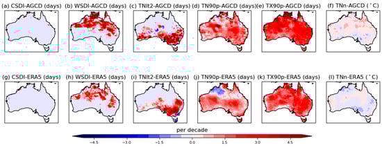 Figure 8 shows the decadal trends of each of the climate extreme indices for AGCD and ERA5. The indices generally show a very weak negative to strong positive trend, with a reasonably good agreement between ERA5 and AGCD. CSDI and TNn typically show very weak negative to zero trends in both AGCD and ERA data sets, suggesting declines in cold day duration and low temperature extremes (Figure 8a,g, and Figure 8f,i). WSDI and TNlt2 show positive trends over the northern and south-eastern parts of Australia, respectively, and weak negative trends elsewhere in both datasets (Figure 8b,h, and Figure 8c,i). TN90p and TX90p show a stronger positive trend over most of the domain, suggesting an increase in the number of warm nights and warm days (Figure 8d,j, and Figure 8e,k). The biggest disagreement between the two datasets is evident for TN90p and TNn, with ERA5 simulating a negative trend over north-western Australia for TN90p and a stronger negative trend than AGCD for TNn.