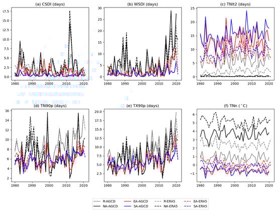 Interannual variability over the four NRM regions for (a) Cold Spell Duration Indicator (CSDI), (b) Warm Spell Duration Indicator (WSDI), (c) Number of days when minimum temperature is below 2 °C (TNlt2), (d) Number of warm nights (TN90p), (e) Number of warm days (Tx90p), and (f) Coldest daily minimum temperature (TNn). Values from AGCD in solid lines and those from ERA5 in dashed lines for Southern Australia (SA—blue), Eastern Australia (EA—red), Rangeland (R—grey), and Northern Australia (NA—black).