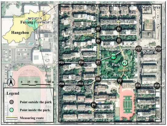 Chunqiu Park and its surroundings, located in the Fuyang District of southwest Hangzhou, were the study sample sites. Figure 2 shows the location of the study area and distribution of the measurement routes and sites. The park has a 1.08 ha area and the east, south, west, and north sides of the park’s border have respective buffer distances of 75, 90, 120, and 75 m. Natural vegetation predominates throughout the park, accounting for 73.96% of the vegetation and 17.85% of the water bodies. The park surrounding built-up area is a typical local residential neighborhood that is categorized as a compact medium (LCZ 2) by the local climate zone (LCZ) classification system [49], with structures 18 m tall and a building coverage ratio of 36.82%, and the width of the road can be divided into three classes, which are 6 m, 12 m, and 20 m. Figure 3 shows the characteristics of the built environment outside the park.