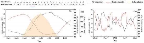 The weather data recorded by the Fuyang District Meteorological Bureau for 19 August 2021 (a), meteorological data (air temperature, relative humidity) provided by the Fuyang Meteorological Bureau for the month of July, August 2021 (b).