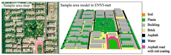 ENVI-met is a grid-based numerical simulation software for three-dimensional models. Based on the fundamentals of fluid dynamics and thermodynamics, ENVI-met replicates microscopic qualities in urban environments and evaluates the effects of the atmosphere, greenery, buildings, and materials by modelling the interaction of the ground and plants with air [50]. The model input file and input file for the meteorological boundary conditions are required by ENVI-met [51]. ENVI-met has been widely applied in urban climate studies [46,52] and has been validated to produce relatively accurate results under multitudinous climatic conditions [13].
