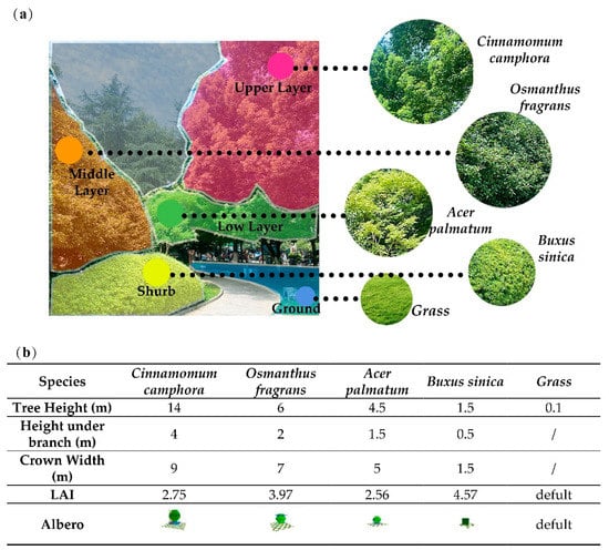 Dominant plants in each layer of the plant community structure in the park (a), plant in parameters in ENVI-met (b).