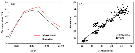 The simulation scenarios were created according to the simulation scheme and used as model input files for the numerical simulation. Appropriate meteorological data from the meteorological stations in Fuyang District were used in the meteorological boundary conditions input file. We chose 15 July 2021 as a typical meteorological day and used the air temperature, relative humidity, wind direction, wind speed, and solar radiation of that day as input files by comparing the meteorological data recorded at the meteorological station from July to August 2021 (Figure 4b). The meteorological inputs used for the simulations are listed in Table 3.