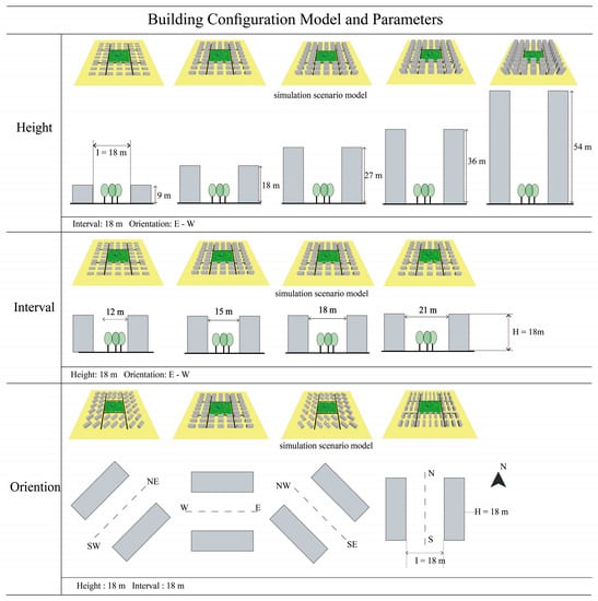The building configurations around urban green spaces in Hangzhou were examined through the Zhejiang Province Geographic Information Public Service Platform (https://ditu.zjzwfw.gov.cn/) (accessed on 10 May 2021) in May 2021, including the building height, building interval, and building orientation. The surveyed building configurations were classified according to the LCZ classification system [49], which served as the foundation for the simulation scenarios in this study. The building parameters in the simulation scenarios adhered to the control specifications set forth in the Building Design Code and other pertinent standards. Therefore, in this study, the building parameters of the park surrounding areas were set from three perspectives (Figure 8): building height, building interval, and building orientation. The building height values in the height group were set to 9, 18, 27, 36, and 54 m. The building interval value was constant at 18 m, and the building orientation as E-W does not change. The building interval values in the interval group were set to 12, 15, 18, and 21 m, respectively; the building height was 18 m, and the buildings orientation as E-W did not change. The building orientation in the orientation group was set to N-S, E-W, NE-SW, and NW-SE, and the building interval height was constant at 18 m.