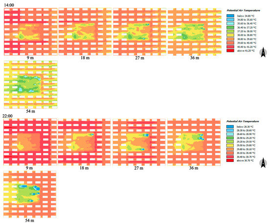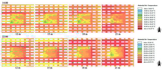 Spatial distribution of air temperature at 1.5 m above ground in the simulation scenarios of the building height at 14:00 and 22:00.