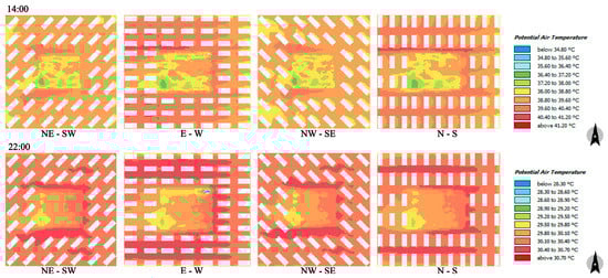 Spatial distribution of air temperature at 1.5 m above ground in the simulation scenarios of the building orientation at 14:00 and 22:00.