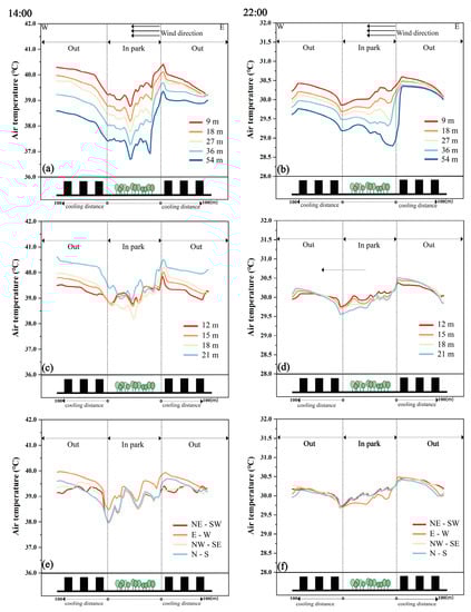 A comparison of the temperature curves for different building heights shows that the temperature curves become lower with increasing building height, with the highest curve being 9 m and the lowest being 54 m. The temperature difference between the two adjacent curves is 0.3–0.5 °C, meaning that the temperature at the corresponding position decreases by 0.3–0.5 °C for every 9 m increase in building height (Figure 12a,b). According to the trend in the temperature curves for different building intervals, as the values of the interval increased, the magnitude of the change in adjacent temperature curves gradually increased. Overall, the reduction in the temperature curves for adjacent intervals was not significant and the temperature curves did not change consistently inside or outside the park. The temperature steadily increased in the exterior building sections as the interval widened. However, at 14:00 the trend was towards a decrease followed by an increase inside the park, with the “18 m” temperature curve being the lowest and the “21 m” curve being the highest. In the park’s interior at 22:00, there was a trend toward less activity (Figure 12c,d). According to the trends in the temperature profiles of the various building orientations, there was little variation in the temperature values with building orientation; however, the trends in the temperature profiles varied greatly, particularly in the exterior building areas. The temperature curves for “E-W” and “N-S” broadened smoothly and gradually from the park to the exterior of buildings. In contrast, for the point of entry into the built-up area, the “NE-SW” and “NW-SE” curves demonstrated a sharp increase in temperature, followed by erratic fluctuations (Figure 12e,f).