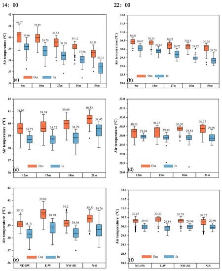 At 14:00, the average temperature inside the park in the four-building orientation simulation scenarios was in the order of E-W > N-S > NE-SW > NW-SE, the average temperature in the external building area was E-W > N-S > NE-SW > NW-SE, and the average temperature difference between the internal and external areas was E-W > N-S > NW-SE > NE-SW. The mean temperature difference between the inside and outside of the park ranged from 0.42–1.1 °C. At 22:00, for the four orientation scenarios, the average temperature was in the following order: inside the park, NW-SE > NE-SW > N-S > E-W and outside the park, E-W > NW-SE > NE-SW > N-S. The average temperature difference inside and outside was in the order of E-W > NE-SW = NW-SE > N-S, ranging from 0.26–0.46 °C (Figure 13e,f).