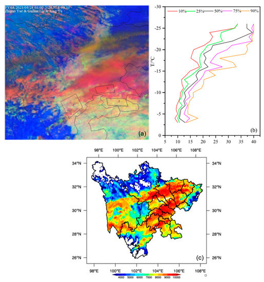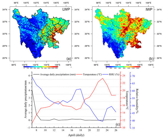 Since the beginning of winter, most areas in Sichuan, especially the western Sichuan Plateau and the Panxi region, have had less precipitation than usual. The temperature is higher than the same period in previous years. The weather is mainly cloudy to sunny, and the air is dry. Due to the continuous high temperature and low humidity weather, the Panxi region has been experiencing consecutive droughts, and the forest fire risk is on the high side, which has a great impact on agricultural production, forest fire prevention and social life. Figure 1a,b shows the average distribution of cloud parameter characteristics in April 2021. The figure shows that the cloud water content over Sichuan Basin is sufficient, with the liquid water and ice water contents mostly above 700 g/m2 and 900 g/m2. The cloud water content over the Panxi region is obviously lower, with dark blue colour blocks in most areas. The liquid water and ice water contents are around 200 g/m2 and 250 g/m2, with a maximum is 600 g/m2 and 800 g/m2 respectively. Combined with the daily variation characteristics of precipitation, relative humidity and temperature in Panxi region (Figure 1c), there is a precipitation process before and after 7 April, with an average daily precipitation of 4 mm and a temperature below 15 °C. After 9 April, there is no significant precipitation in the Panxi region. The relative humidity is also low, and the minimum value could reach 40%. The temperature is stable at around 16 °C in the early stages and then begins to rise significantly on 19 April, reaching the maximum value of 24 °C. By the 26th, the drought in the Panxi region is widespread. Most areas have moved from severe drought to extreme drought, and the forest fire danger level has reached high danger.