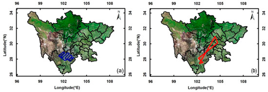 According to the forecast, there will be a continuous precipitation process in the Panxi region from 28 April to 8 May. For this precipitation process, the Weather Modification Office of Sichuan Province is organising and implementing three operational precipitation enhancements by aircraft. The operational aircraft is Xiayan B−3625, and the operational area is Liangshan Prefecture in Panxi region. The first operation was carried out on 28 April 2021. The flight time is 10:40~13:15, and the seeding time was 11:20~12:20. The second operation was carried out on 4 May 2021. The flight time was 10:40~12:55, and the seeding time was 11:10~12:10. The third operation is carried out on 4 May. The flight time is 17:05~18:43, and the seeding time is 17:14~18:18. Due to the lack of visible light in the evening, it is easy to do the distortion of liquid and water content, optical thickness, particle effective radius in the satellite data. Therefore, the first two flights are mainly analysed. Figure 2 shows the detailed flight trajectories. Two operations are cold cloud seeding, and 20 silver iodide cigarette sticks each are used as cloud seeding catalyst, respectively. The seeding time is about 60 min, and 2~4 silver iodide cigarette sticks are dispersed at an interval of about 10 min. According to the satellite cloud images and observation records in flight, the flight altitude of the two operations is about 6000 m, the operating layer temperature is about −10 °C, the wind direction is westerly, and the clouds are moving at a speed of about 40 km/h. From the longitude-latitude conversion of this speed, it can be seen that the clouds in the operation area move eastward at 0.3~0.4 °E/h. According to the flight and seeding time, 10:00~11:00 is the pre-operational time, 12:00~13:00 is the seeding time, and 13:00~15:00 is the post-operational influence time.
