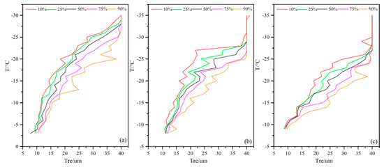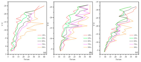 Satellite observations can only provide information from the cloud top. In order to understand the conditions inside the cloud, Rosenfeld and Lensky [20,30] proposed a cloud microphysical analysis method based on satellite reversal technology, that is, the temperature (T) and particle effective radius (Re) at the cloud top at different development heights within a certain area are used approximately to replace T and Re at different development heights inside the cloud cluster. Thus, this gives the variation curve of Re with T within the cloud cluster in that area, i.e., the T−Re profile. Cloud droplets grow continuously as the airflow increases. T-Re can be used to express the growth rate of cloud particles and applied to the analysis of cloud physical processes to calculate the particle effective radius of cloud pixels, count the cloud pixels in the area every 1 °C, and then sort the particle effective radius from small to large. Draw the T-Re diagram according to the Re value corresponding to the percentage of samples (10%, 25%, 50%, 75%, 90%).