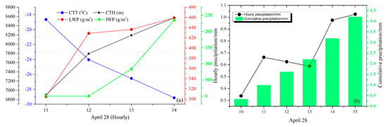 Cloud parameters and precipitation accumulation change in hours on 28 April 2021: (a) cloud parameters and (b) precipitation accumulation.