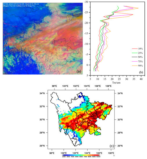 The RGB, T−Re and CTH at 10:00 on 4 May 2021: (a) RGB; (b) T-Re; (c) CTH.
