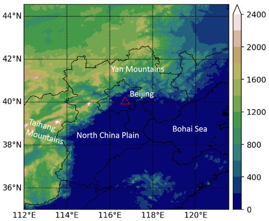 The circulation patterns corresponding to flash heavy rainfall in the Beijing–Tianjin–Hebei region were taken as the study subject. The circulation pattern data were based on the 500 hPa geopotential height data from the European Centre for Medium-Range Weather Forecasts reanalysis data (ERA5: https://cds.climate.copernicus.eu/cdsapp#!/dataset/reanalysis-era5-pressure-levels?tab=overview, accessed on 23 April 2023), with a regional range of 112°–122° E, 35°–45° N and a resolution of 0.25° []. The statistics covered hourly geopotential height data from 1 May to 31 September for the period 2013–2021. When using the FConvNeXt method, the geopotential height data were converted to image information as the training data were three-channel images. For the precipitation data, we used the automatic weather-station-observed precipitation as the flash heavy rain event selection, and the fused precipitation data (CMPA: http://data.cma.cn/data/, accessed on 23 April 2023) [,] were used to plot the rainfall in the 2021 testing set. CMPA (China Meteorological Administration Multi-source merged Precipitation Analysis) is a high-resolution precipitation product released by the National Meteorological Information Center in China. Pan et al (2018) described the method used to produce this data. It merges three sources of precipitation data, i.e, the rain gauge precipitation data collected at approximately 40,000 automatic weather stations, the radar quantity precipitation estimate (QPE) and the CMORPH-satellite-retrieved precipitation products. The data were upgraded by integrating the precipitation information with the national non-assessment station after quality control, and were then compared with the GPM and CMORPH precipitation, which better reflected the precipitation in China, particularly near topography, as Sun et al. (2020) showed. Therefore, we took the CMPA dataset for the observation of rainfall in this study. The study area is shown in Figure 1.