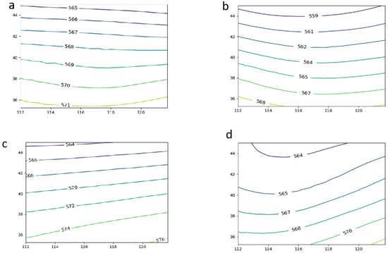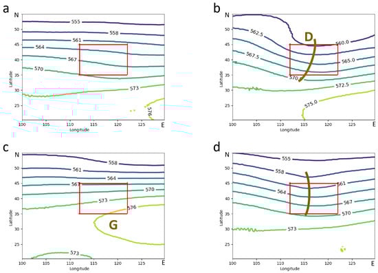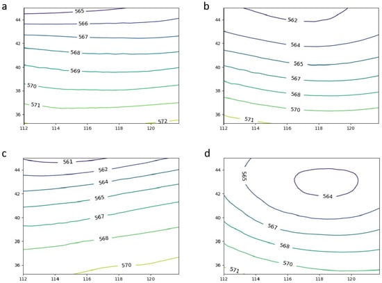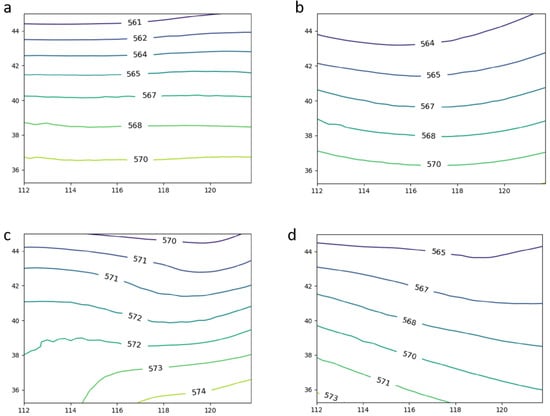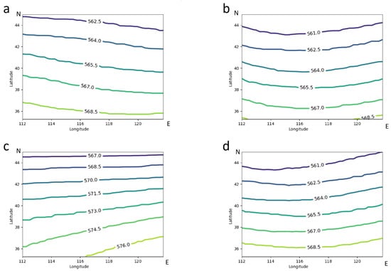 According to the above classification criteria, a total of 316 flash heavy rainfall events were selected from 2013 to 2020, including 100 days of WFS, 89 days of LVT, 72 days of SPT, and 55 days of UTP. The 500 hPa geopotential heights corresponding to the four types of intense rainfall were synthesized separately (as shown in Figure 3). Forecasters generally rely on large-scale weather features, as shown in Figure 2, to subjectively identify different weather patterns, but, for the target area (the red box in Figure 2), as shown in corresponding subjective circulation pattern maps (Figure 3), it was much more difficult to distinguish. For example, the northeast vortex (Figure 2b) was intercepted in the limited region, looked like a deep trough (Figure 3b), and could be easily confused with the UTP-type classification(Figure 3d).