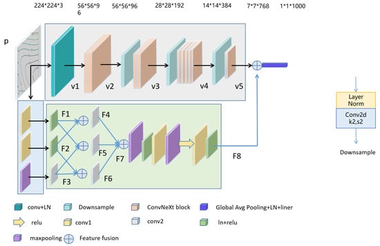 The execution process in the ConvNeXt module consisted of five stages. The first stage: the original image (p) of size 224 × 224 × 3 was fed into a 4 × 4 convolutional layer and processed by layer normalization, resulting in a vector (v1) of size 56 × 56 × 96. The second stage: next, v1 was passed into a ConvNeXt module group consisting of 3 ConvNeXt modules (see Section 2.3.3). The output was a vector (v2) with a size of 56 × 56 × 96. The third stage: then, v2 was passed into a down-sampling layer, and then into a ConvNeXt module group with 3 ConvNeXt modules. The output was a vector (v3) with a size of 28 × 28 × 192. The processes in the fourth and fifth stages were similar to the process of the third stage, with the difference being that the fourth and fifth stages consisted of 9 and 3 ConvNext modules, respectively. They outputted vectors of size 14 × 14 × 384 (v4) and 7 × 7 × 768 (v5) respectively.