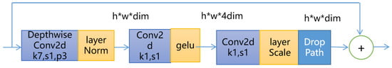 A key module in this network structure was the ConvNeXt module, which consisted of three main parts, as shown in Figure 5. The first was composed of a convolutional kernel of size 7, a convolutional operation with a padding of 3, and a layer normalization operation. The second part was composed of a convolutional operation of size 1 and an activation function. The third part consisted of a convolutional operation, a layer-scale operation, and a drop-path operation. The purpose of the drop-path operation was to discard some features at random, which could then reduce the probability of over-fitting. The final output was summed with the original output by applying the concept of a residual structure. The residual function could be described as a cell in which the original input is x. After a series of convolutional operations, the output function F(x) was obtained, whereupon the residual function H(x) = F(x) + x, and then it was activated by the GELU function. Its purpose was to prevent the partial loss of valid information in the original image as a result of a series of operations.
