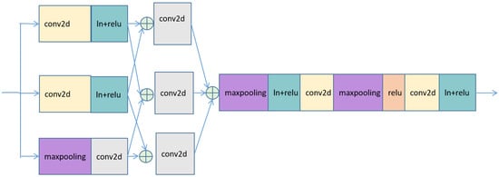 In the first half, feature was extracted in parallel through two convolutional operations and one max-pooling operation to obtain three output features. The three features were fused in pairs, and the results are shown in Formula (3). Then, the convolutional operation was carried out separately to process ; finally, the three features were fused by to obtain Y. The initial convolutional operation was conducted to extract the initial information in the original image and retain more of the edge features. The max-pooling operation extracted the maximum features from the original image and only retained the most prominent features of the image. Then, two convolutional operations were used to extract features. As the features obtained by the max-pooling operation were the most prominent global features, this feature value was large, and the feature value obtained by the convolutional operation would be comparatively small. To narrow the feature value gap between the two results, two convolutional operations were used to increase the feature value. This was also critical for improving the accuracy of weak features.