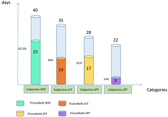 We selected the flash rainfall events in 2021 as an independent testing set to evaluate the FConvNeXt model’s generalization ability by verifying future events using historical data. Since using historical data to predict future events is an important practical application, this section focuses on the results obtained from the 2021 testing set. The distribution of 2021 compared to the 2013–2020 multi-year mean (Figure 9) showed a significant difference. There was an obvious reduction in the WSF sample up to 3 days; a significant increase in LVT events up to 22 days; a slight reduction in SPT up to 7 days; and a flat UTP at 7 days. This difference in the sample distribution on the testing set poses a greater challenge for deep learning classification.