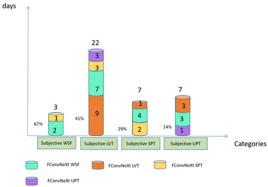 FConvNeXt test results in 2021 (the first column: FConvNeXt WSF is indicated in blue-green. There are three days of subjective WSF, and the blue-green bars represent two days being correctly classified. The yellow bar represents one day of one SPT case being incorrectly identified as the WSF type).