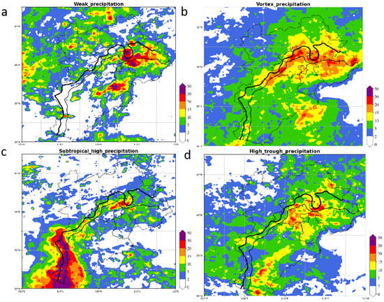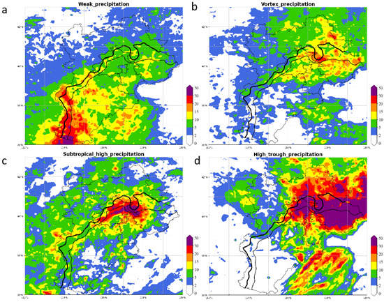 Precipitation distribution of 2021 subjective classification results. ((a) WSF, (b) LVT, (c) SPT, and (d) UTP. The thick black line indicates the 500 m terrain height, and the thin black line indicates the 200 m terrain height).