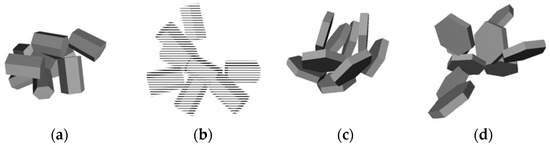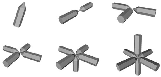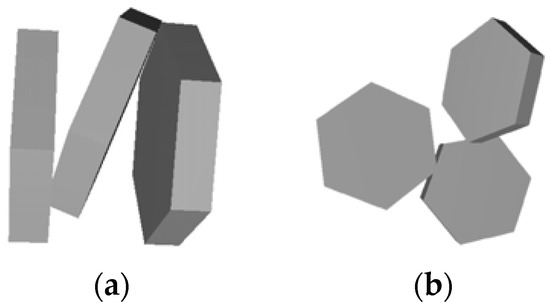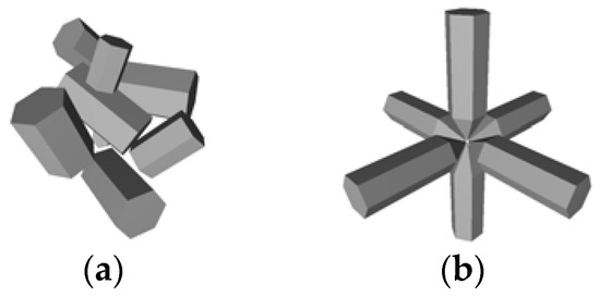 By aggregate, we mean the object consisting of several particles that are attached to each other at one or several points. The positions of these particles are fixed, but when the spatial orientation of the aggregate is changed, all particles change their position simultaneously. In this work, we use regular shapes of crystals for cirrus clouds as the basic particles for aggregates: hexagonal column; hexagonal plate [36] (see Figure 1).