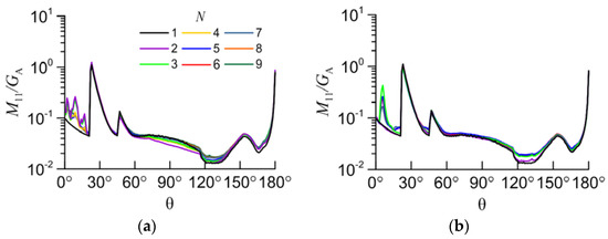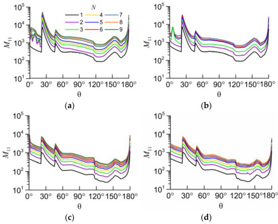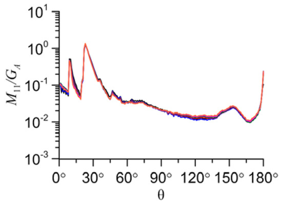 For the created aggregates, light-scattering matrices were calculated for all scattering angles within the geometrical optics approximation at the wavelength of 0.532 µm with the refractive index of particles being 1.3116 (ice water) [38]. Since the aggregates in a cloud are assumed to be randomly oriented, the calculation was carried out for one million orientations for each aggregate. As an example, the M11 and M22 elements of the light-scattering matrix are shown in Figure 4 and Figure 5. The value of M11 for the scattering angle of 0° is removed from the plots because it is too high to display. The element M22 is normalized over M11:m22 = M22/M11.