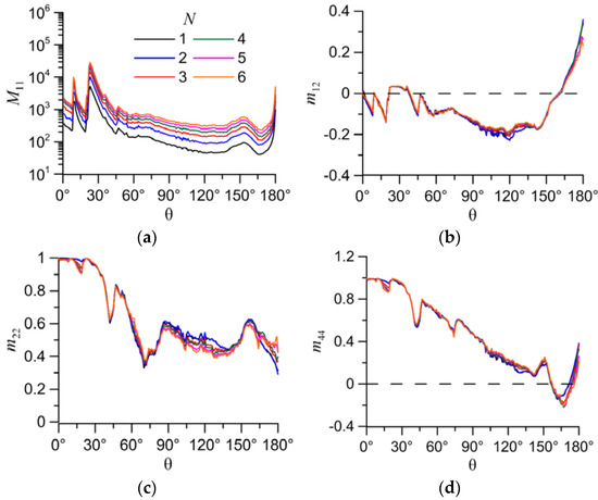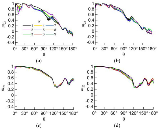 Dependences of elements of the light-backscattering matrix on scattering angle (θ): (a) M11; (b) m12; (c) m22; (d) m44.