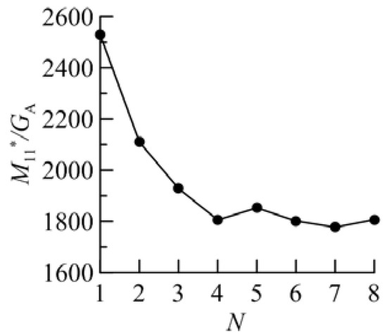 Let us examine the case of a compact aggregate of plates (see Figure 6d). For convenience, we separately plotted M11/GA for the forward scattering direction for these aggregates vs. N (M11*/GA in Figure 7). In this case, the peak of intensity in the forward scattering direction is re-scattered by another plate appearing right behind the first one with an increasing number of particles. That peak is created by the forward transmission of light through the large plane-parallel facets of a plate particle. While in the case of a non-compact aggregate of plates, the particles do not overlap each other, so the light moves freely in the forward scattering direction (see Figure 8).