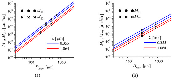 M11 and M22 vs. Dmax at two wavelengths of incident light: (a) for aggregate of 8 columns; (b) for bullet-rosette.