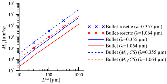 Now it is possible for us to compare M11 for bullet-rosette (6 bullets) and for a single bullet using the existing database. Since Dmax for aggregate and for a single particle is different, we use the dependence of M11 on the length of a single bullet (Lbul). Then, M11 for a single bullet was multiplied by the total scattering cross-section for bullet-rosette. The result is presented in Figure 14.