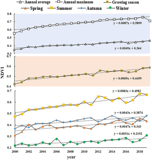 - Liu, Y.; Tian, J.; Liu, R.; Ding, L. Influences of Climate Change and Human Activities on NDVI Changes in China. Remote Sens. 2021, 13, 4326. [Google Scholar] [CrossRef]