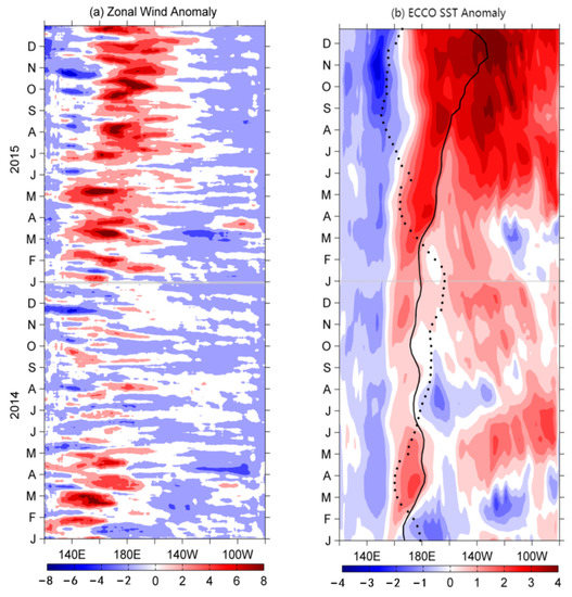 There were abruptly no more strong westerly wind anomalies observed during the following summer of 2014. However, three large easterly wind stress anomalies became strengthened from May to July. The easterly anomalies in May were confined to the equatorial western Pacific (Figure 1a), while the two in June and July spread across the entire equatorial Pacific region. This was possibly related to the colder SST anomalies of the subtropical southeastern Pacific [70]. The easterly wind anomalies strengthened the equatorial upwelling through Ekman transport and pushed the eastern edge of the warm pool back westward. The combined effects caused an abrupt decrease in the SST during the summer of 2014, as shown in Figure 1b.