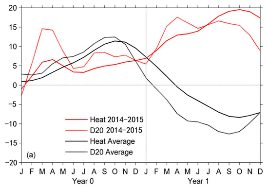 Therefore, the upper OHC should be considered an important indicator of the natural climate variabilities associated with El Niño warming events [51,52,53,54] and can be used to provide ocean thermal trends for accurate El Niño predictions [55,56,57]. Furthermore, budget balance analysis of the upper OHC can advance a clearer understanding of El Niño dynamical development. This study aimed to describe the 2014–2015 warming event as an extended development process of the 2014–2016 extreme El Niño event and figure out what happened with the warming halting over this period. The dynamic processes responsible for the extended warming event were analyzed using a budget analysis of the OHC of the upper ocean at a level of 300 m.