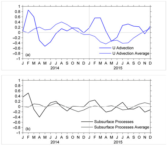 The analysis results indicated that those easterly wind anomalies played a major role in halting the development of the 2014–2015 warming event, which was found to be in agreement with the results of previous research [43,44]. For the composite average and the 1997–1998 El Niño, the OHC tendency was always positive in the equatorial western Pacific during the development process (Figure 3b,c). This was attributed to the contributions of the U advection, V advection, and subsurface processes, which were positive for the composite average El Niño (Figure 5).