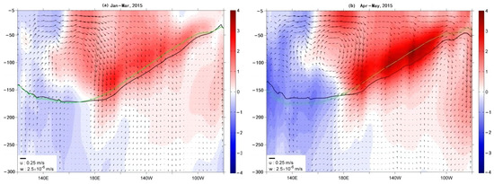 Temperature anomalies with contour intervals of 0.2 °C; ocean zonal velocity anomalies; and vertical velocity (vectors), averaged within the equator band (5° N to 5° S) for the first year of the 2014–2015 warming event, results showed every three months. Note: In the figure, the black and green curves indicate the D20 and the climatology of the D20 averaged during the corresponding month, respectively.