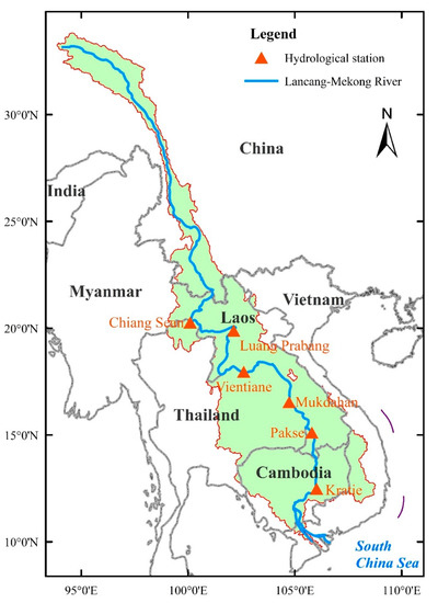We selected six hydrological stations (Chiang Sean, Luang Prabang, Vientiane, Mukdahan, Pakse, and Kratie) to investigate summer discharge variability in the MRB and their correlations with monsoon subsystems (Figure 1). Chiang Sean (20°16′ N, 100°5′ E), the northernmost and westernmost station, and Kratie (12°29′ N, 106°1′ E), the southernmost and easternmost station, located at the most upstream and downstream points among the six stations, respectively.