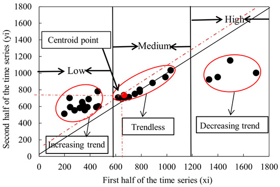 Illustration of the innovative trend analysis (ITA) method showing low, medium, and high values. Reproduced from Meng’s research [42].
