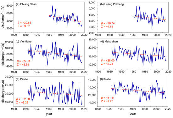 Interannual variation of summer discharge for (a) Chiang Sean, (b) Luang Prabang, (c) Vientiane, (d) Mukdahan, (e) Pakse, and (f) Kratie. Red dashed lines are the linear fitting curves of the summer discharge time series.
