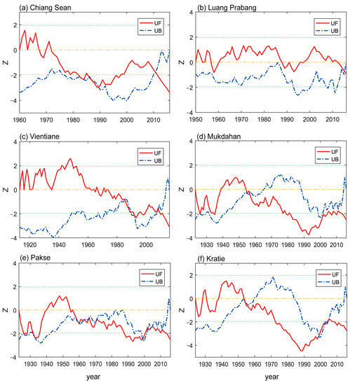 Mann-Kendall (M-K) mutation test of summer discharge at (a) Chiang Sean, (b) Luang Prabang, (c) Vientiane, (d) Mukdahan, (e) Pakse, and (f) Kratie. The green dotted lines (±1.96) and the yellow dash-dotted lines mark significance levels of 0.05 and Z = 0, respectively.