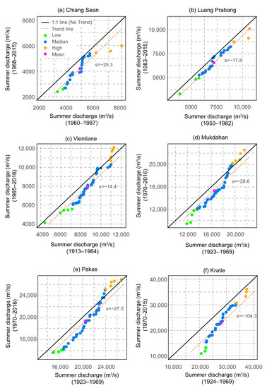 The ITA method was also applied to analyze interannual summer discharge trends in the MRB during the study periods (Figure 5). There are generally decreasing trends of interannual summer discharge at six stations in the MRB, with the highest decreasing rate in Kratie at −104.3 m3/s·year and the lowest decreasing rate in Luang Prabang at −17.8 m3/s·year. The remaining gauges also show a significant decreasing trend: Chiang Sean (−25.3 m3/s·year); Vientiane (−14.4 m3/s·year); Mukdahan (−28.6 m3/s·year); Pakse (−27 m3/s·year).