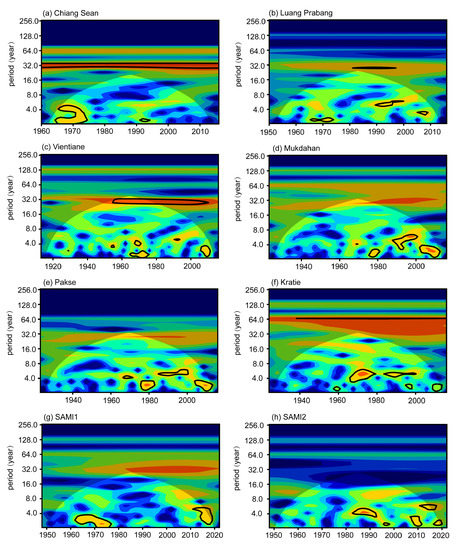 Continuous wavelet transform (CWT) of summer discharge at Chiang Sean (a), Luang Prabang (b), Vientiane (c), Mukdahan (d), Pakse (e), and Kratie (f), and two monsoons include SAMI1 (g) and SAMI2 (h). Warmer colors indicate greater wavelet coefficients and colder colors to smaller wavelet coefficients. Black contour lines enclose areas where the statistical significance is greater than 95%.