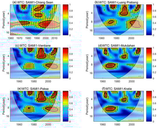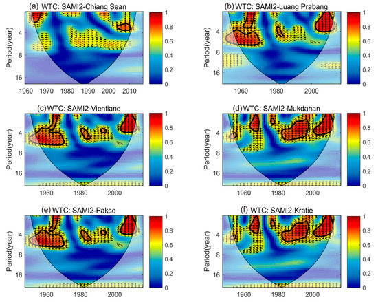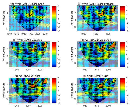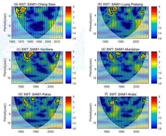 Cross wavelet spectrum (XWT) between SAMI1 and summer discharge at Chiang Sean (a), Luang Prabang (b), Vientiane (c), Mukdahan (d), Pakse (e), and Kratie (f) stations. The red/blue region in the XWT pattern denotes the common high-/low-energy zones of two signals with strong/weak similarities at different timescales. The time–frequency domain arrow directions denote phase relationships between two signals.