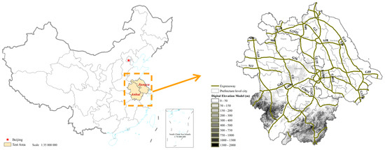 In this study, the meteorological observation data are obtained from 616 traffic meteorological stations, 317 regional meteorological stations and 30 national meteorological stations along the expressways in the test area, which are provided by the National Meteorological Information Center of the China Meteorological Administration. The data quality control method refers to the “Quality Control of Meteorological Observation Data-Surface” (QX/T 118-2020) of the meteorological industry standard of the People’s Republic of China. The traffic accident data in foggy or agglomerate foggy days are from the traffic control departments and news reports of media. The two kinds of data cover the period from 2012 to 2021. The traffic flow data such as vehicle flow rate and congestion index are calculated via road section estimation and road matching based on the mobile location information from internet navigation and national heavy-load freight, which covers the period from 2018 to 2021. These kinds of data are derived from the National Intelligent Road Network Monitoring Platform, and the website is http://hmrc.palmgo.cn/lwzx2/a1c64c3e6c9b76efcbccb8effd58fcad.html (accessed on 15 May 2023). In terms of the information of road sections with hidden dangers due to agglomerate fog, this study uses the information of road sections with frequent agglomerate fog released by the Traffic Administration Bureau of the Ministry of Public Security of the People’s Republic of China in recent years, and the results of expressway traffic meteorological disaster risk survey by the China Meteorological Administration.