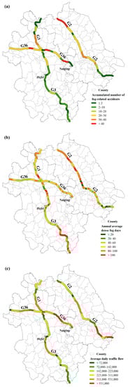 Spatial distributions of (a) accumulated number of fog-related accidents from 2013 to 2018, (b) annual average dense fog days from 2013 to 2018, and (c) average daily traffic flow from 2018 to 2021.