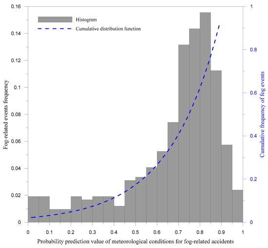 According to Equation (1), the probability prediction values of meteorological conditions for fog-related accidents corresponding to 418 fog events [28,29] in the training set are calculated, and then the frequency of disaster occurrence at a probability interval of 0.05 is calculated by using the statistical method of histogram. Figure 4 reveals that a significant negative skewness appears in the distribution of disaster frequency corresponding to the probability of meteorological conditions, with the skewness and kurtosis being −1.36 and 1.21, respectively, and the left side of the peak shows a monotonically increasing trend. Thus, we count the frequency of fog-related events in the left range of the peak at intervals of 0.01 probabilities. Then, the first occurrence of three consecutive intervals with a frequency of more than or equal to 2 is defined as the change point where the accident frequency begins to increase significantly. The average of the meteorological condition probability prediction value corresponding to the continuous interval is calculated and is used to determine the initial probability value of the meteorological conditions that induce traffic accidents on foggy days. It is found that the probability value of disaster-causing meteorological conditions is 0.19, which is taken as the critical threshold for disaster-causing factor at Levels 1–2.