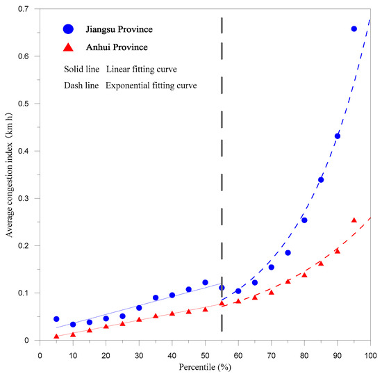 With the increasing road utilization rate, the mutual interference between vehicles is aggravated, and the growth characteristics of the congestion index with traffic volume also changes significantly. The variations in the average congestion index in the unit percentile section of hourly traffic flow are shown in Figure 5. It is found that the line type usually changes from near-linear growth to near-exponential growth. In this study, split points are set from 15% to 85% at an interval of 5%, and the linear fitting formula and the exponential fitting formula between the mean congestion index and the corresponding percentile before and after split points are calculated separately; the goodness-of-fit values on the two fitting curves are recorded separately. The split point corresponding to the maximum value of the average goodness of fit is determined as the position where the congestion index abruptly changes, and the corresponding percentile value of traffic flow is adopted as the classification threshold for the traffic factor. It is found that the largest value of the average goodness of fit appears at the split point that adopts the 55th percentile of the historical hourly traffic flow dataset, which can be regarded as the cut-off point when the traffic flow becomes saturated with conflict from the free and stable state. Accordingly, the 55th percentile value of the above historical hourly traffic flow dataset is defined as the classification threshold for traffic the factor (9871 vehicles h−1 in Jiangsu Province and 5405 vehicles h−1 in Anhui Province). If the hourly traffic flow on the segmented road during the target time period is higher than the threshold, it is considered the peak (risk) traffic flow condition; otherwise, it is regarded as the off-peak (normal) condition.
