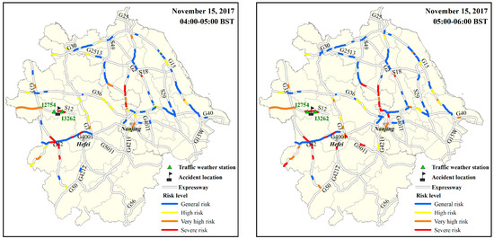 Assessment results of the risk level prediction model of expressway agglomerate fog-related accidents (from 04:00 BST to 10:00 BST on 15 November 2017).