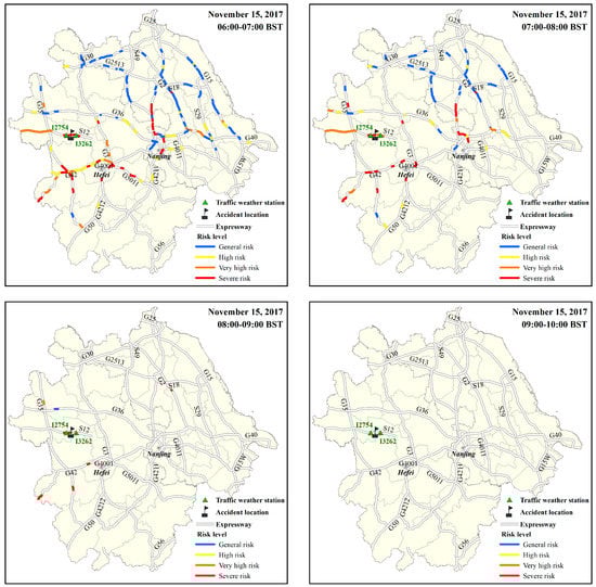 Figure 6 provides the output of the risk prediction model of the expressway agglomerate fog-related accidents. It can be seen that the risk level in northwestern Anhui is obviously higher than that in other road networks in the test area before and after the occurrence of accidents. Since the early morning of November 15, the coverage of higher-risk or above of agglomerate fog-related accidents has gradually expanded from the northwest to southeast, and rapidly weakened from southeast to northwest after reaching its peak during 06:00–07:00 BST. From 08:00 BST to 09:00 BST, there was generally no risk of agglomerate fog-related accidents along the expressway in the test area, but the accident section still showed the severe risk level, indicating that the simulation results are reasonable and can provide targeted tips for determining the risk of local road traffic safety.